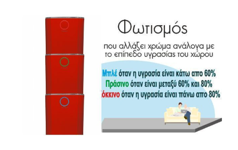 ✔ Το φωτιστικό στην πρόσοψη αλλάζει χρώμα ανάλογα με την υγρασία του χώρου, δίνοντάς σου οπτική ενημέρωση.